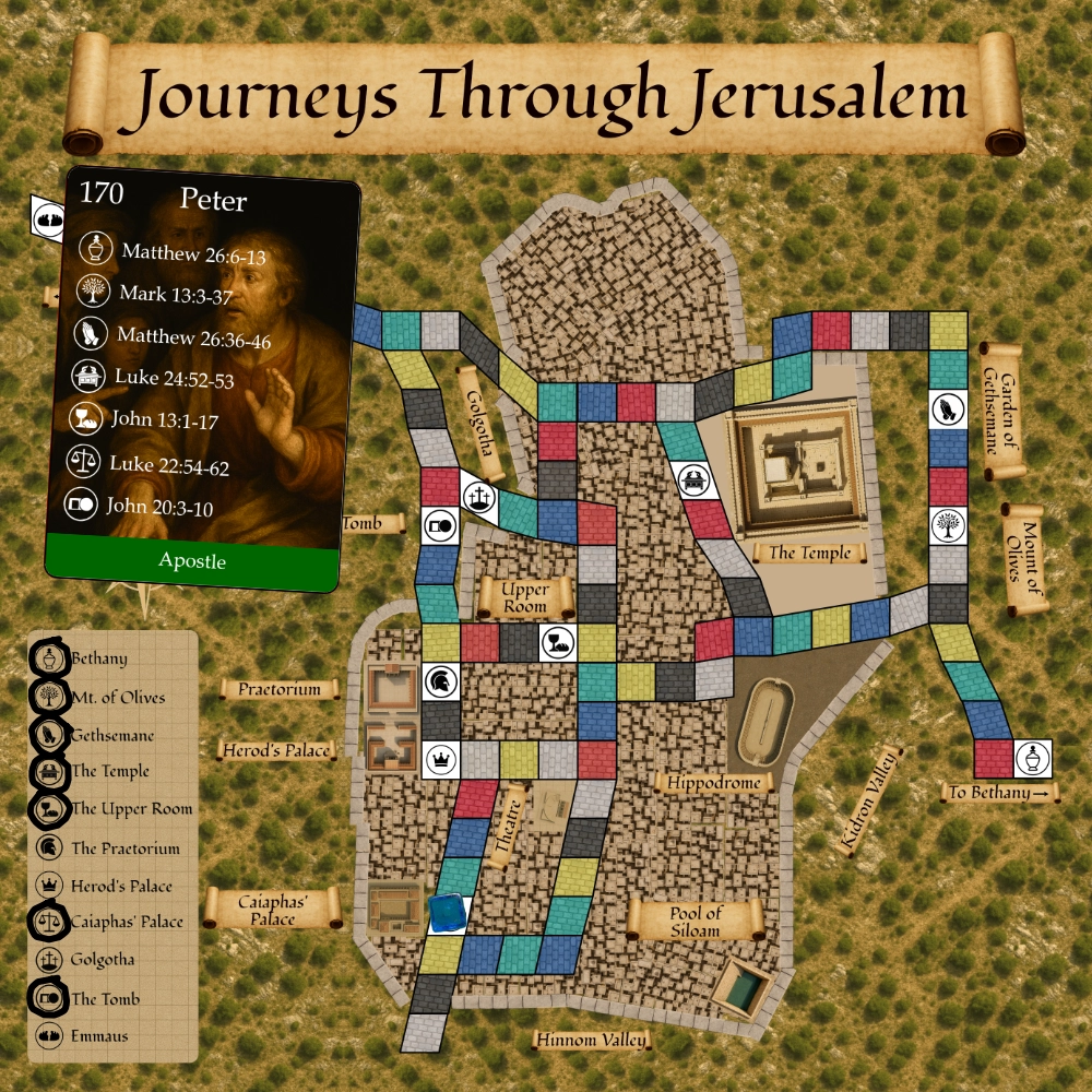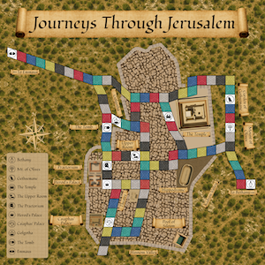 Journeys through Jerusalem has been designed by SDG Games to teach and commemorate the events surrounding Jesus' death and resurrection through engaging gameplay that combines strategy, Biblical knowledge, and meaningful storytelling. Each character's journey reflects actual sites they likely visited based on the Gospel accounts.