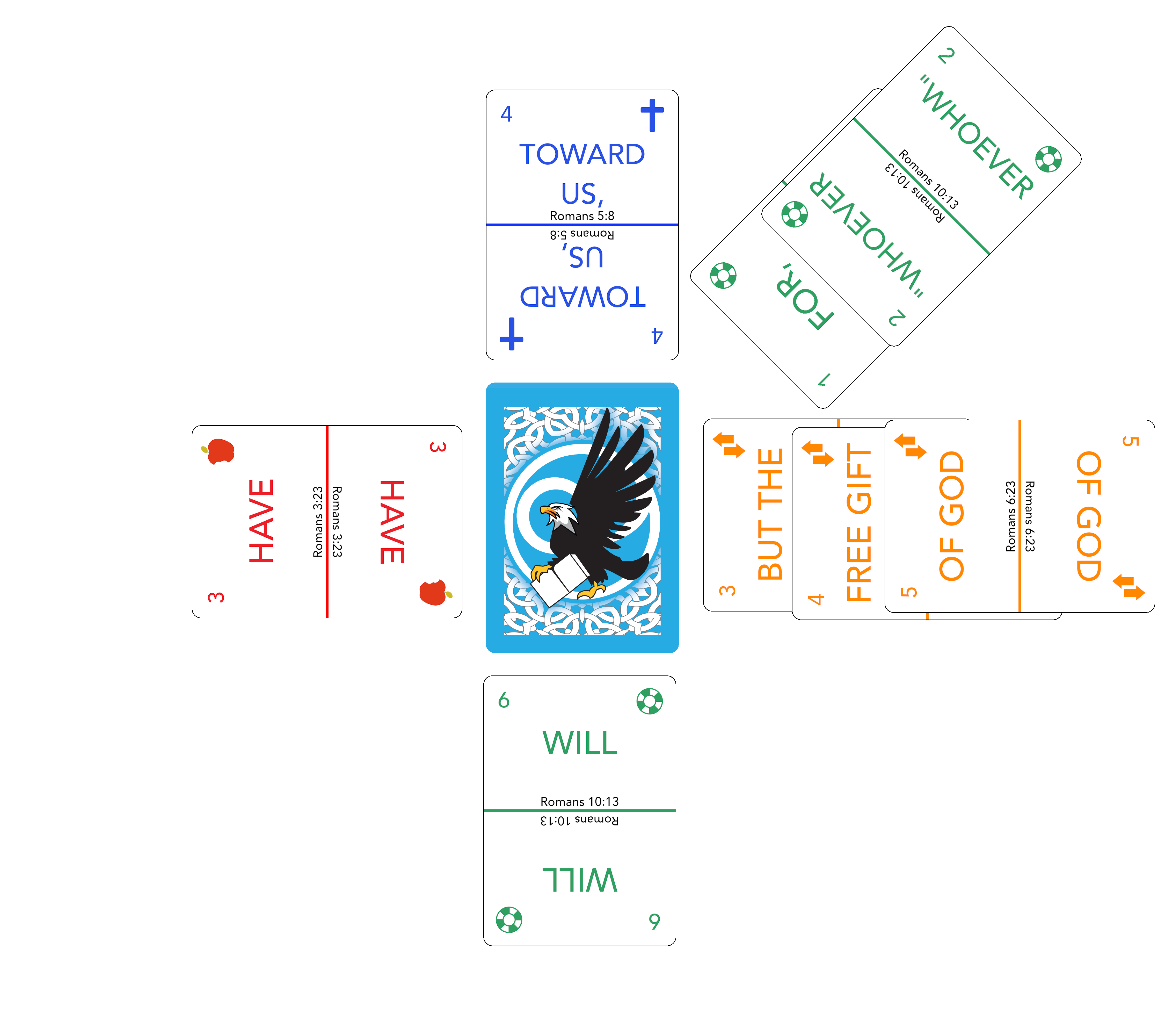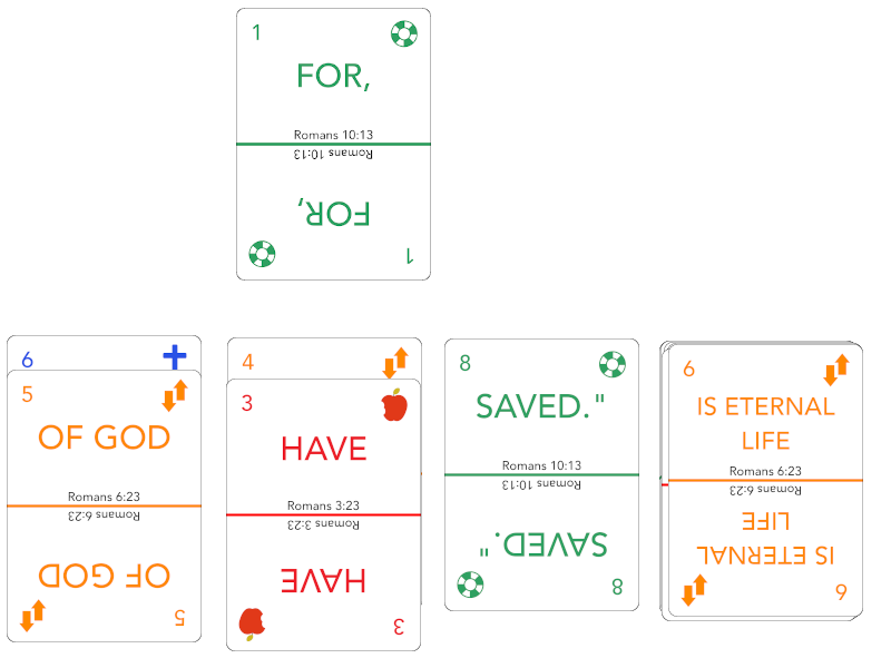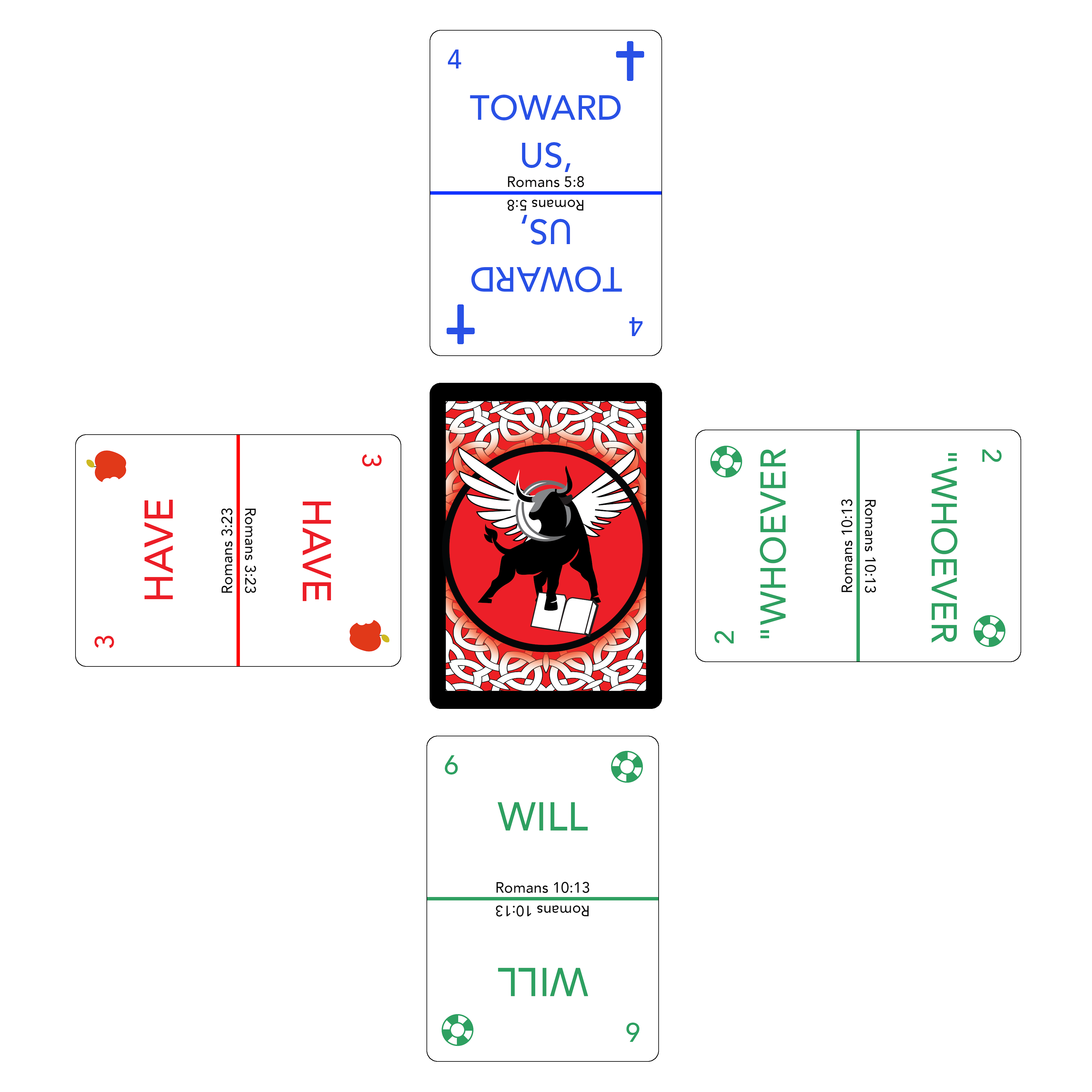 If any player (yourself or others) has played a “1” card from a given verse/suit and the top card in your Store pile is the “2” from the same verse/suit, you can play your “2” card on top of their “1” card as you read aloud the word or words on the card (e.g. calling out “All” as you play the “2” card from Romans 3:23). You cannot play your “2” on top of the “2” played by someone else, so if multiple players have the “2” it becomes a race to see who can play their card first.