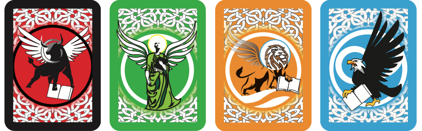 The different decks are identified by the color and icon on the back of the card. The four icons represent the four traditional symbols for the four gospel writers: