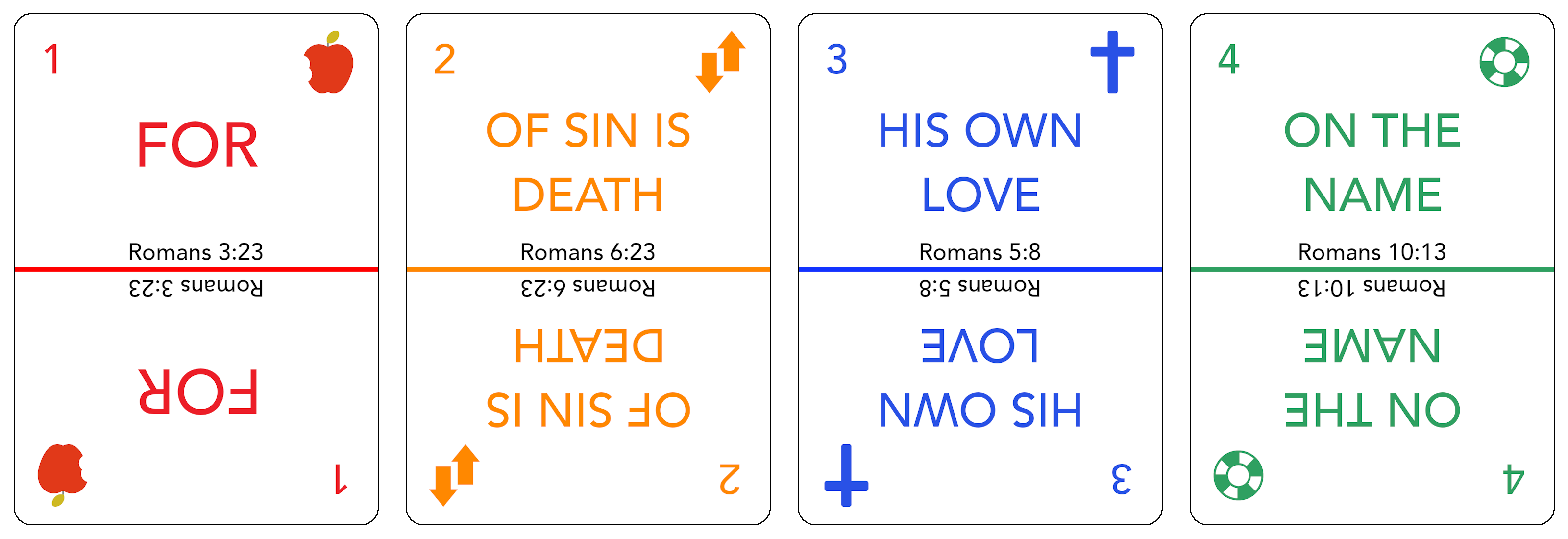 Each playing deck has 4 suits, each based on one verse from the book of Romans in the Bible.