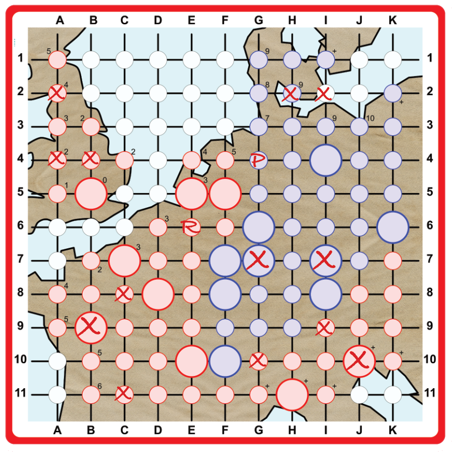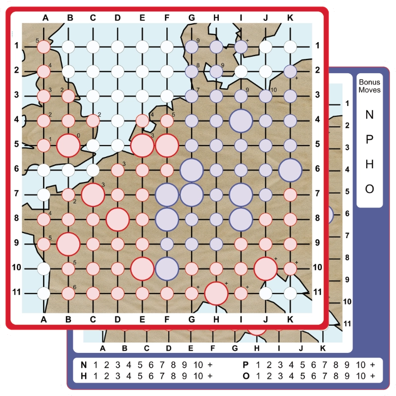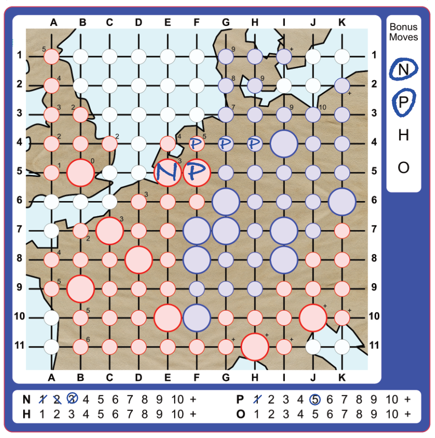 - On his second turn he moves to F4 where he ships the Pentateuch. He writes a "P" in the circle at F4, circles the "5" in the "P" row of the table, and crosses off the "2" in the "N" row.
