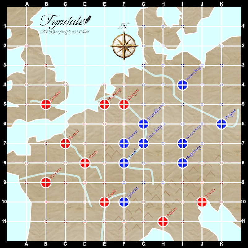 William Tyndale has fled England to Europe with the mission of translating the Bible from the original Hebrew and Greek into English. The Bishop of London is determined to stop him. Tyndale will need to move around Europe to avoid capture. As he completes translation of portions of scripture, he must visit a new Printing Centre to get each one printed, and then get the printed copies to a Coastal City for shipment to England.