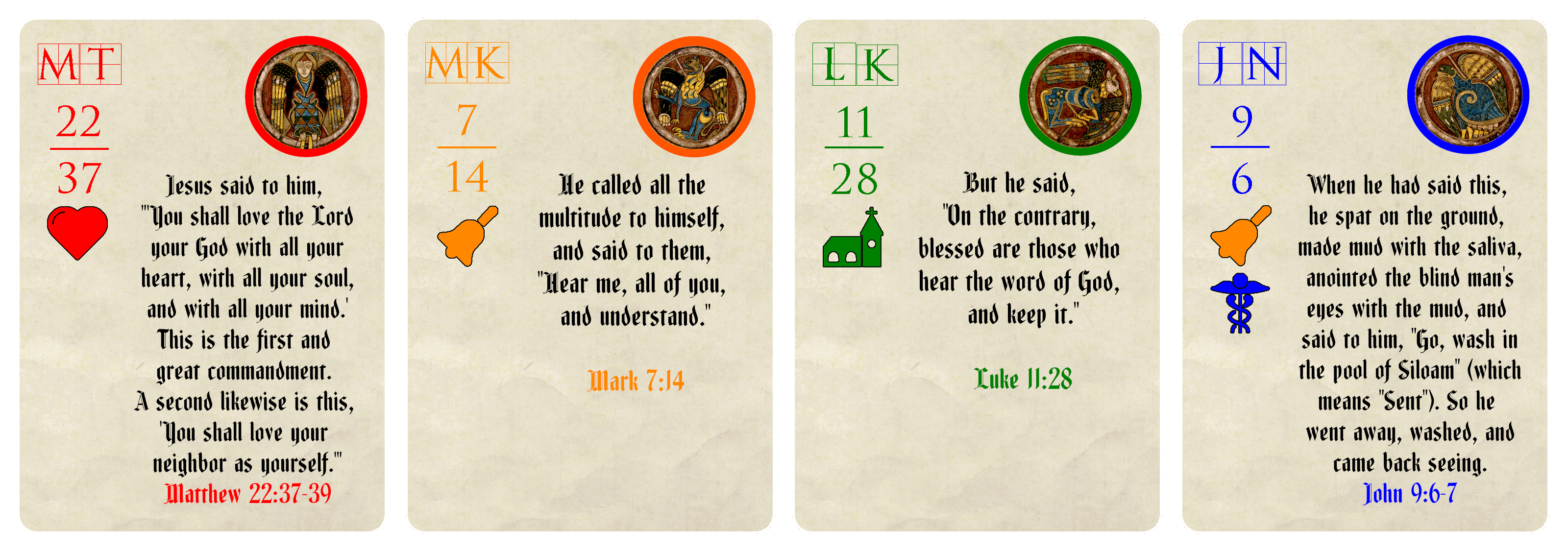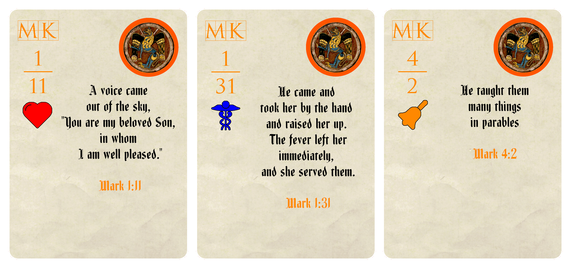 There are twelve cards in each suit with each card having a passage from the corresponding Gospel (e.g. Mark 1:11). The value of each card is based on the chapter and verse of the first (or only) verse in the passage on the card.