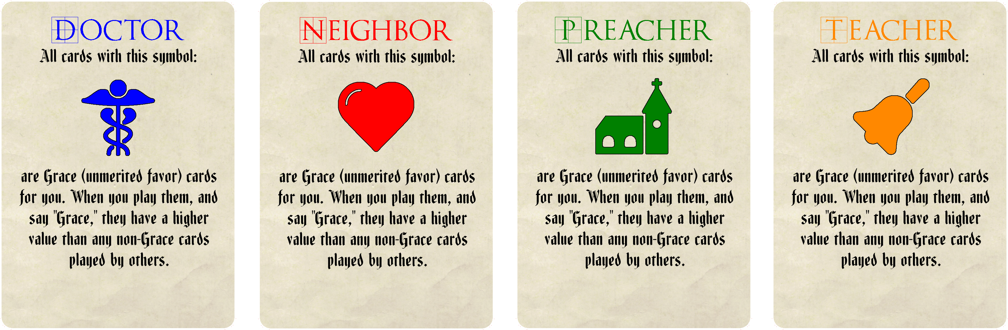 A card that has the symbol associated with a player’s role is a “Grace” card for that player. If he plays that card and he or any other player verbally proclaims “Grace” (which means “unmerited favor”), then his card is worth more than any non-Grace card played.