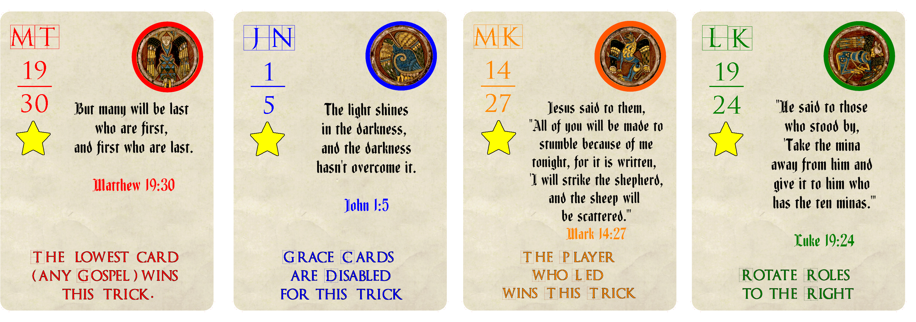 There are four suits in the game, corresponding to the four Gospels in the Bible (Matthew, Mark, Luke, and John).