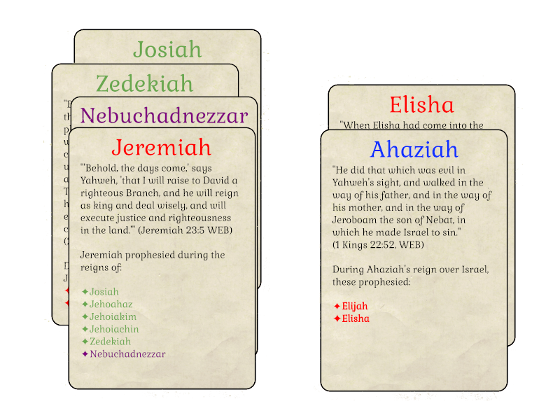 The name at the top of the card is the prophet or king. If the name is red, then this represents a prophet. If the name is blue, then this is a northern kingdom (Israel) king. If the name is green, this king is from Judah. If the name is purple, then this represents a foreign king.
