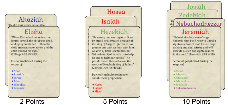 Players earn points by building sets of cards that match a Biblical prophet with the kings who reigned during the years of his prophesying, or a Biblical king with the prophets that prophesied during their reign. The more cards in the set, the more points the player earns.