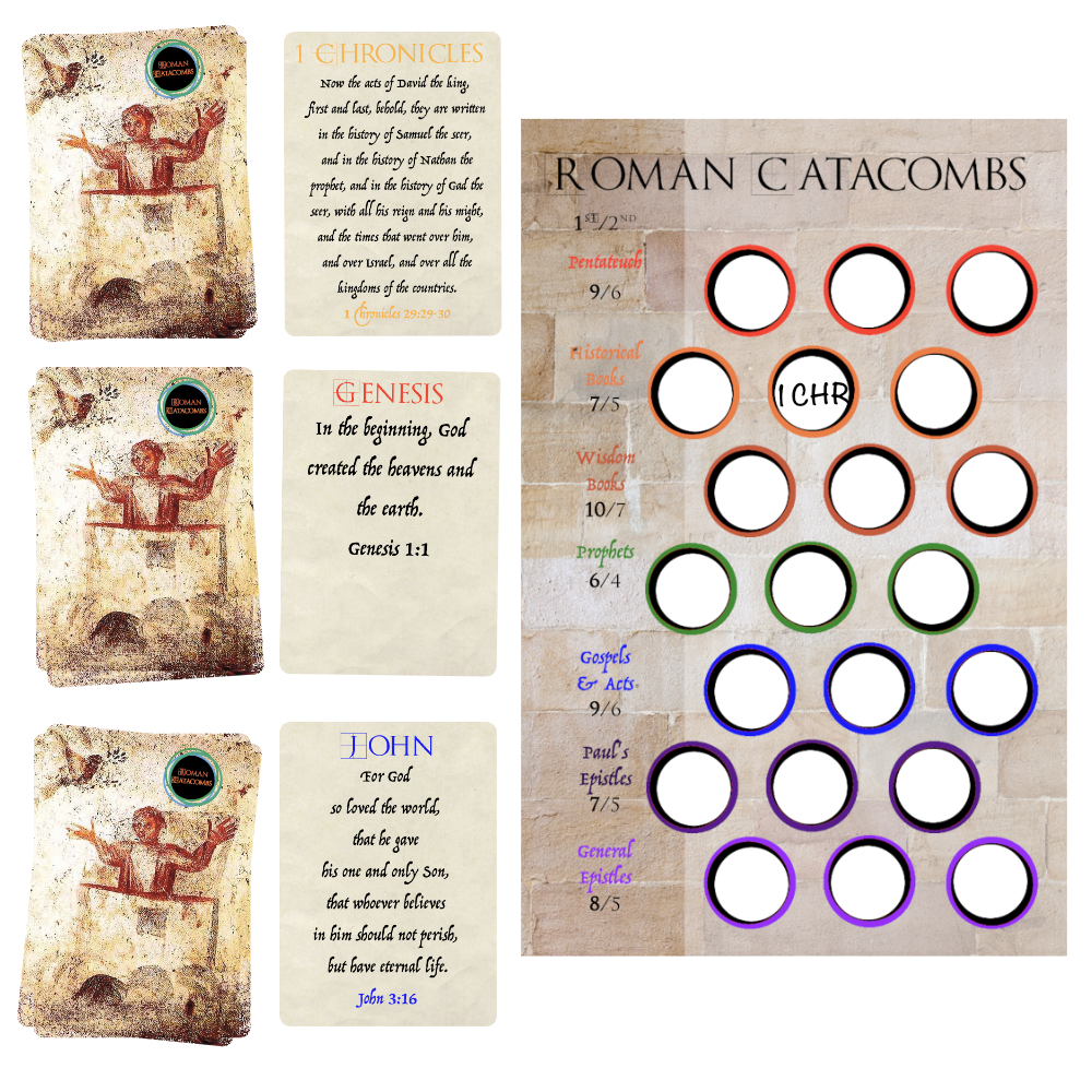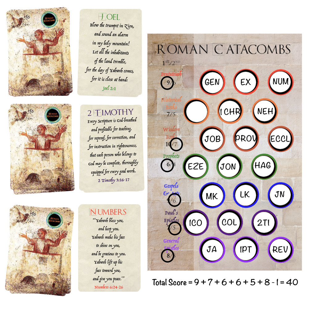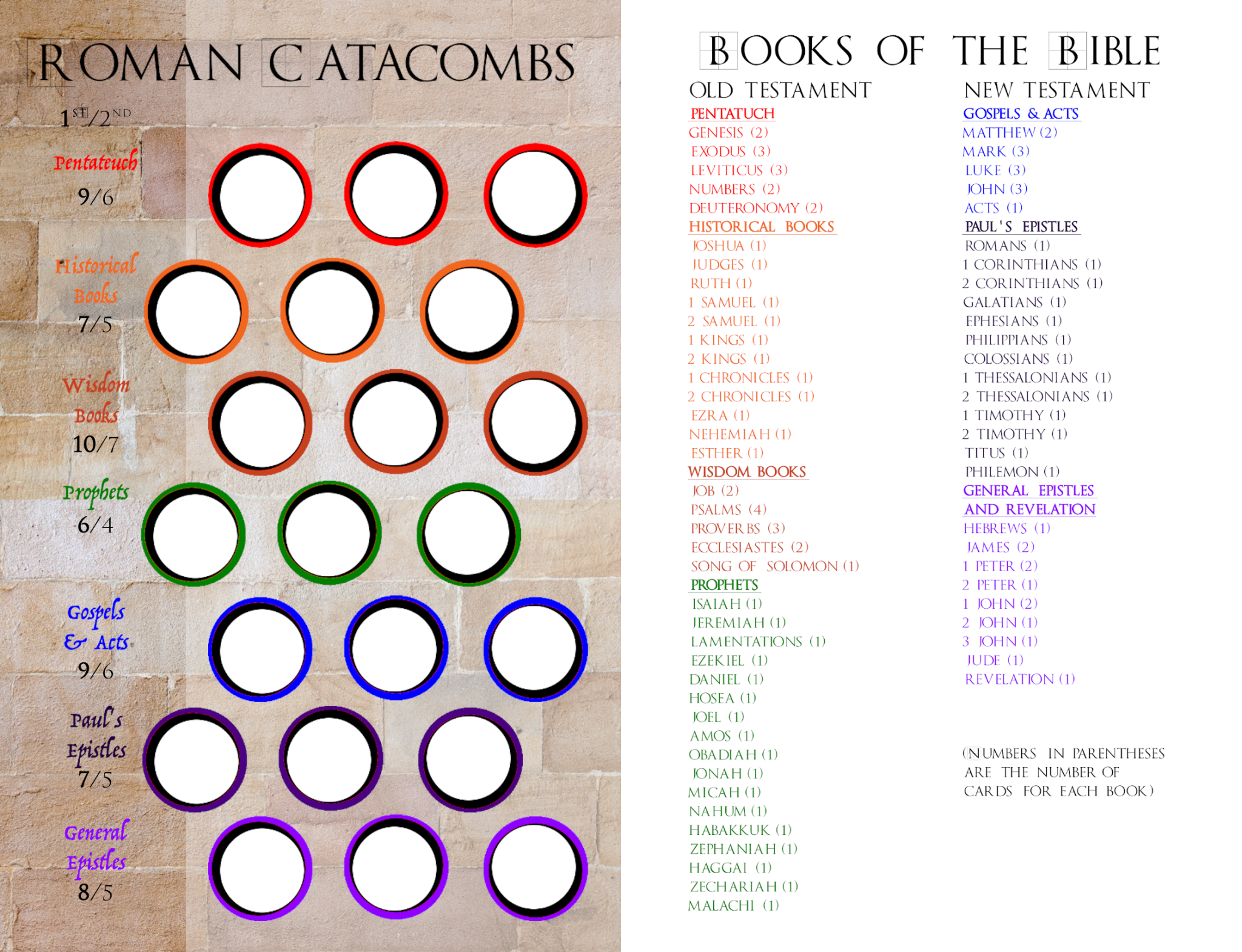 The back of the scorecards lists all of the books of the Bible organized into these categories and in canon order. After the name of each book is a number in parentheses. This indicates how many cards for that book are in the Roman Catacombs deck.